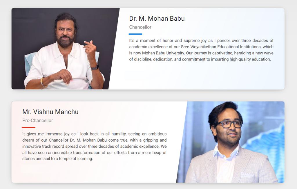 Dr. M. Mohan Babu, the chancellor of Mohan Babu University is a renowned movie actor, producer, and passionate educationist, founded Mohan Babu University with a mission to provide quality education at an affordable cost. With the launch of Mohan Babu University, Dr. Babu’s efforts have been rewarded, and his legacy of providing access to high-quality education to the rural poor will continue for generations to come.