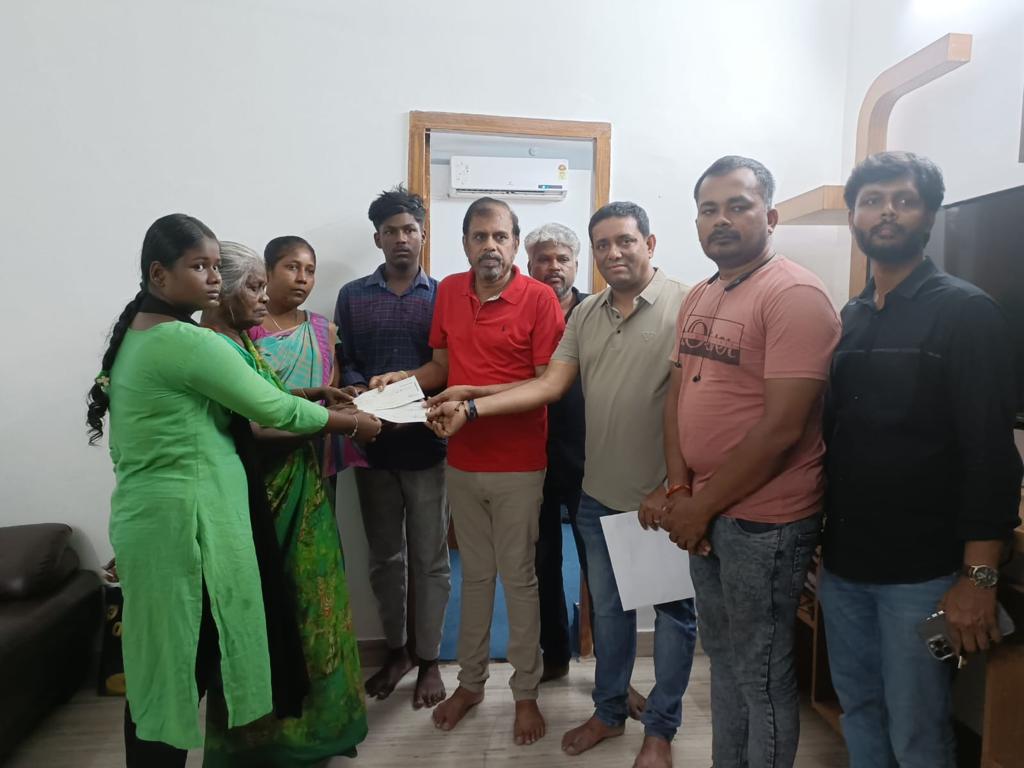 Producer M.S. Manzoor has contributed Rs. 12 Lakhs towards the family members of Light Man S. Kumar, who died accidentally during the shoot of ‘Weapon’. Late S. Kumar’s wife Juliet, his mother, and his kids collected the cheque from producer M.S. Manzoor. Executive Producer Mr. Rizwan, FEFSI Head Mr. R.K. Selvamani, Light Union Head Mr. Senthil, Manager Kanthan, and Director Guhan Senniappan along with the weapon team were present during this occasion.
