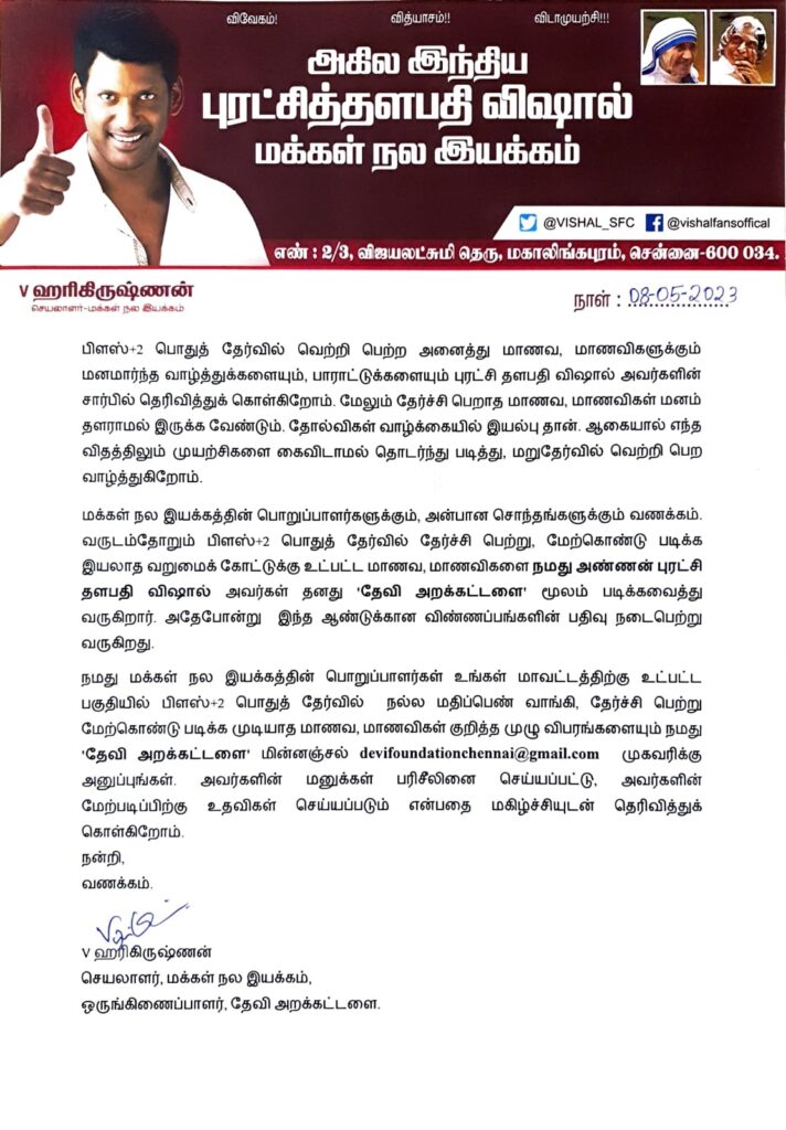 மக்கள் நல இயக்கத்தின் பொறுப்பாளர்களுக்கும், அன்பான சொந்தங்களுக்கும் வணக்கம். வருடம்தோறும் பிளஸ்+2 பொதுத் தேர்வில் தேர்ச்சி பெற்று, மேற்கொண்டு படிக்க இயலாத வறுமைக் கோட்டுக்கு உட்பட்ட மாணவ, மாணவிகளை நமது அண்ணன் புரட்சி தளபதி விஷால் அவர்கள் தனது ‘தேவி அறக்கட்டளை’ மூலம் படிக்கவைத்து வருகிறார். அதேபோன்று இந்த ஆண்டுக்கான விண்ணப்பங்களின் பதிவு நடைபெற்று வருகிறது.