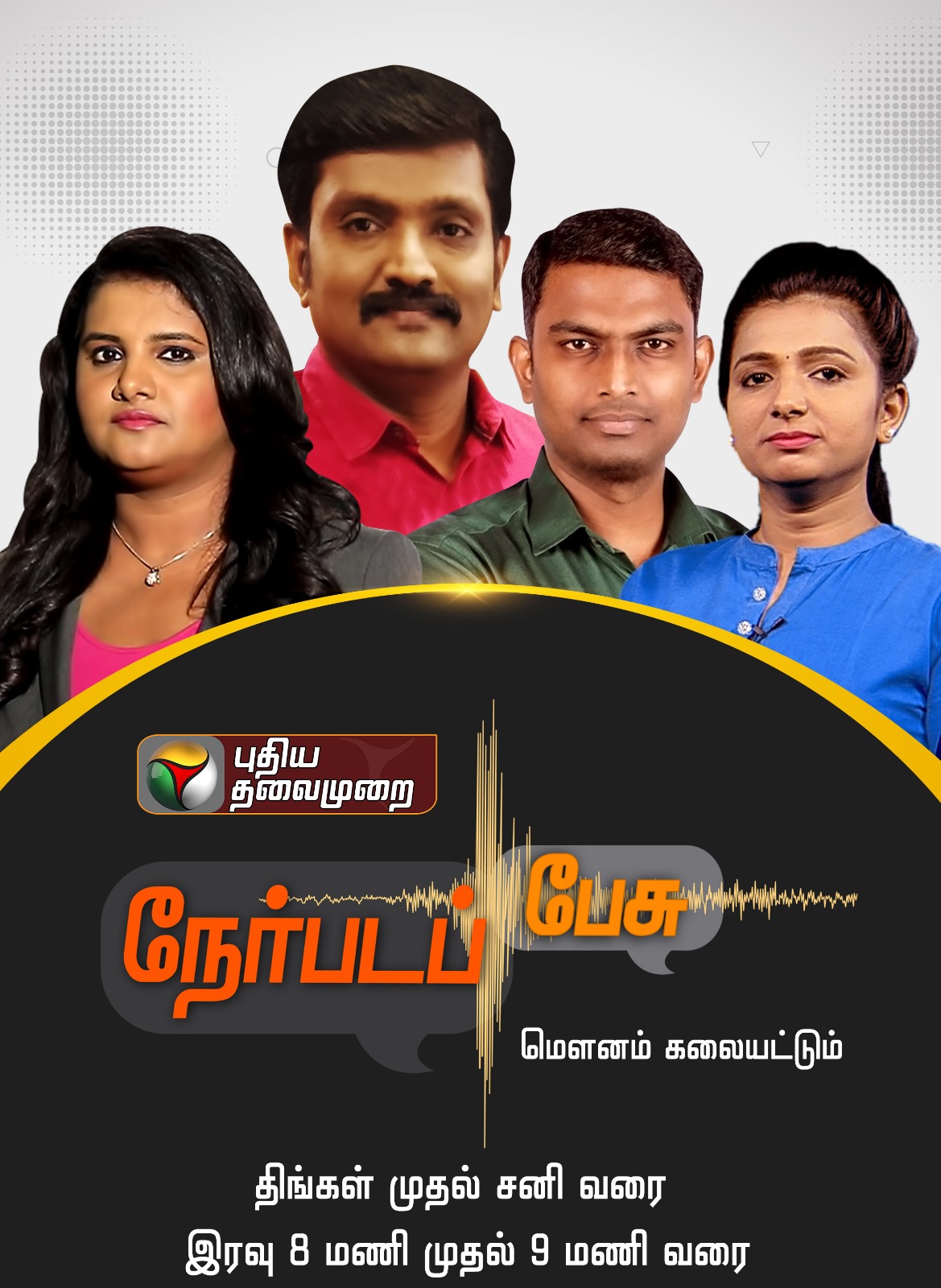 ஆக்கப்பூர்வமான விவாத நிகழ்ச்சியாக திகழும் “நேர்படப் பேசு” திங்கள் முதல் சனி வரை இரவு 8:00 மணி முதல் 9:00 மணிவரை புதிய தலைமுறை தொலைக்காட்சியில் ஒளிபரப்பாகிறது.