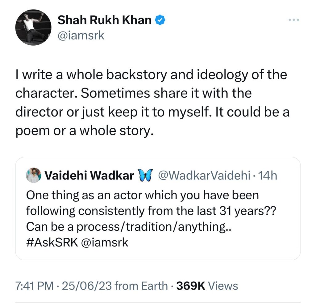 One thing that he has been following consistently from the last 31 years SRK reveals , I write a whole backstory and ideology of the character. Sometimes share it with the director or just keep it to myself. It could be a poem or a whole story.”