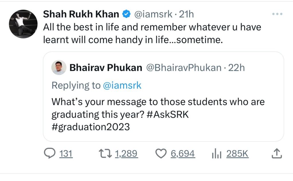 புதிதாக பட்டம் பெற்ற பட்டதாரிகள் குறித்த கேள்விக்கு பதிலளித்த ஷாருக், ” நல்வாழ்த்துக்கள். நீங்கள் கற்றுக் கொண்டதை சில சமயங்களில் நினைவில் வைத்துக் கொண்டு வாழ்க்கையில் வெற்றி பெற வேண்டும்.” என்றார்.