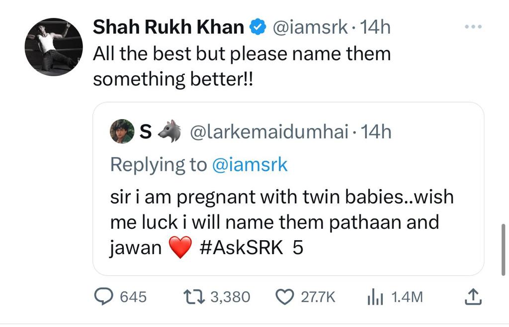 உரையாடலில் ஒரு ரசிகர், ”கருவுற்றிருக்கும் இரட்டை குழந்தைகளுக்கு நானும், என் மனைவியும் இணைந்து அவர்களுக்கு ‘பதான்’ மற்றும் ‘ஜவான்’ என பெயரிட திட்டமிட்டிருக்கிறோம்” என தெரிவித்தார். இதற்கு பதிலளித்த ஷாருக்கான், ”வாழ்த்துக்கள். ஆனால் அவர்களுக்கு வேறு ஏதாவது சிறப்பான பெயரை வைக்கலாம்” என்றார்.