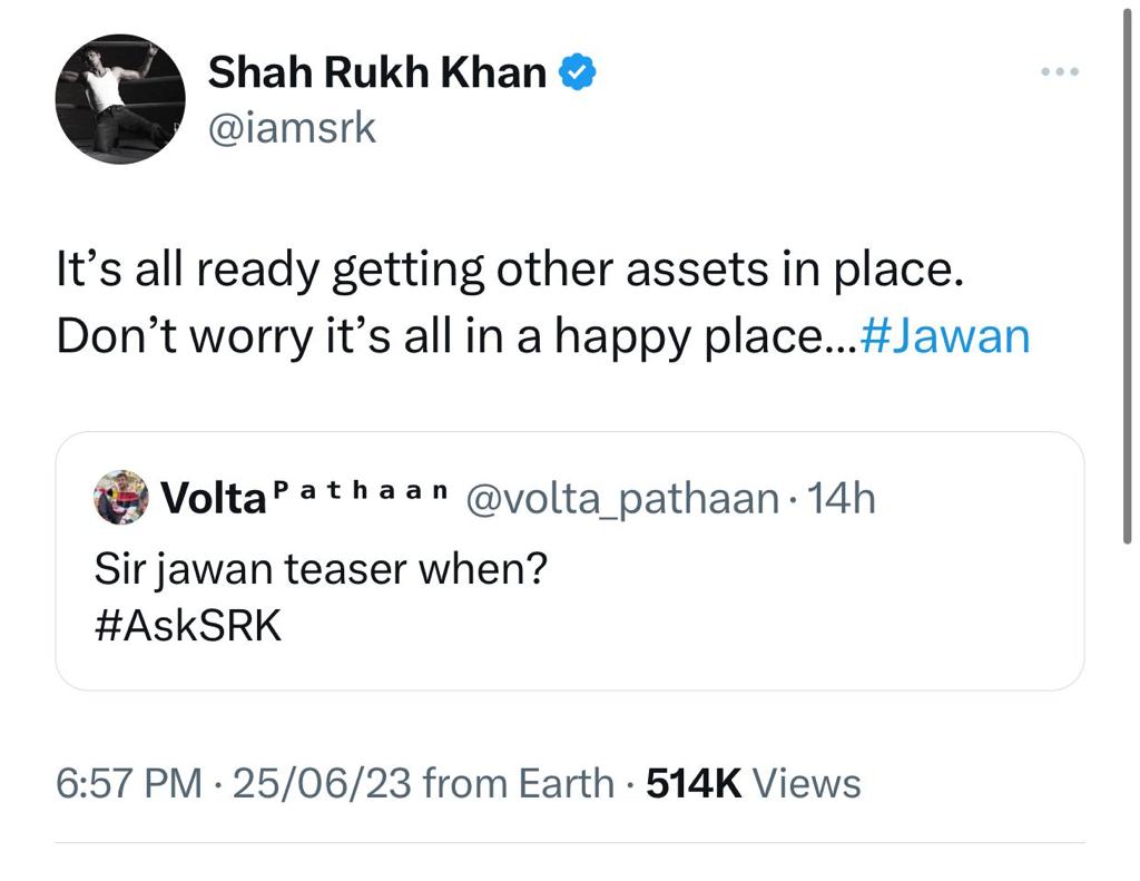 Revealing the most important information related to the teaser of his highly-anticipated movie Jawan, SRK said, “It’s all ready getting other assets in place. Don’t worry it’s all in a happy place… #Jawan