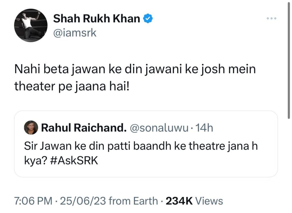 Reverting to a user’s question, SRK wrote, “Nahi beta, jawan ke din jawani ke josh mein theater pe jaana hai!”