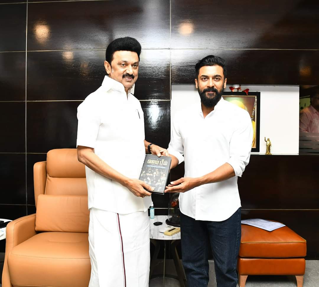 நீதியரசர் திரு.சந்துரு அவர்களோடு, #JaiBhim திரைப்படத்திற்குப் பிறகும் தொடர்ந்து சமூக அக்கறையோடு செயல்பட்டுவரும் தம்பி திரு.சூர்யா, இயக்குநர் திரு. @tjgnan ஆகியோருக்கு மீண்டுமொருமுறை வாழ்த்துகள்” என மாண்புமிகு முதலமைச்சர் M. K. Stalin அவர்கள் தெரிவித்துள்ளார்.