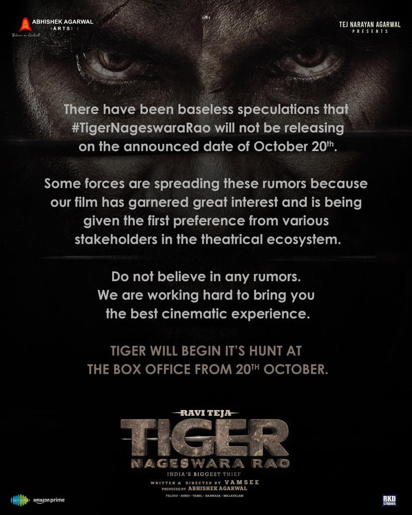 “There have been baseless speculations that #TigerNageswaraRao will not be releasing on the announced date of October 20th.