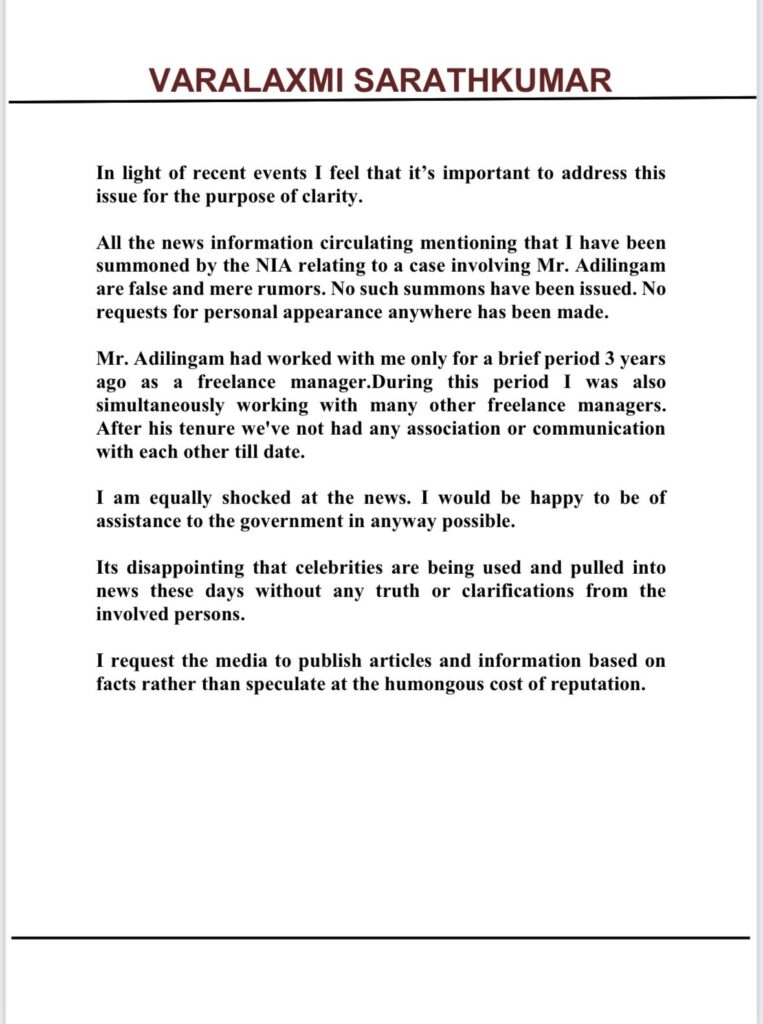 All the news information circulating mentioning that I have been summoned by the NIA relating to a case involving Mr. Adilingam are false and mere rumors. No such summons have been issued. No requests for personal appearance anywhere has been made.