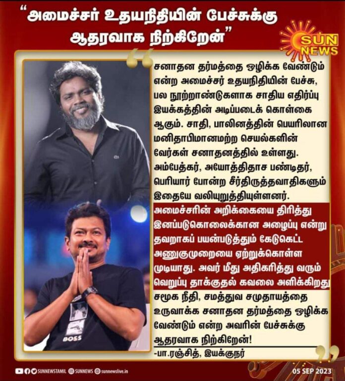 Minister Udhyanithi’s (@UdhayStalin) statement calling for abolishment of Santana Dharma is the core principle of anti-caste movement for centuries. The roots of inhumane practices in the name of caste and gender lies in the Sanatana Dharma. Revolutionary leader Dr Babasaheb Ambedkar, anti-caste reformers such as Iyotheedass Panditar, Thantai Periyar, Mahatma Phule, Sant Ravidas have all advocate the same in their anti-caste ideology. The malignant attitude of distorting the minister’s statement and misappropriating it as a call for genocide is unacceptable. The growing hate and hunt for the minister’s is very disturbing. I stand in support of Udhaynithi’s words calling for eradication of Sanatana Dharma to establish a society with social justice and equality. My solidarity to minister Udhaynithi Stalin!