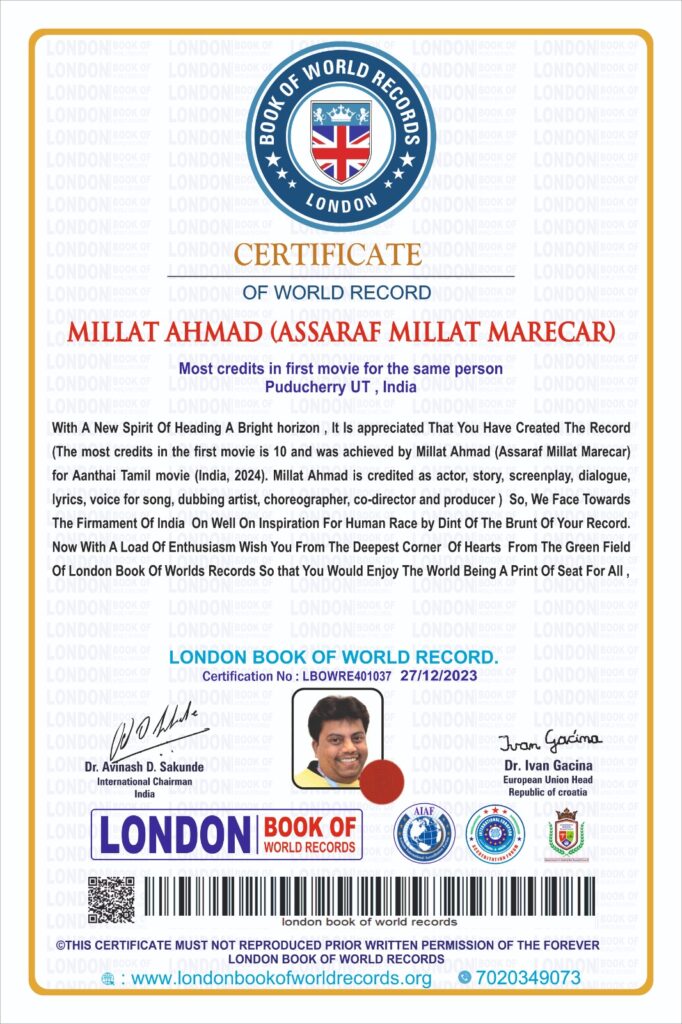 காரைக்காலைச் சேர்ந்த, சிங்கப்பூரில் வசிக்கும் எழுத்தாளர் மில்லத் அகமது “ஆந்தை” என்ற படத்தைத் தயாரித்துள்ளார். இந்த படம் வருகிற பிப்.16ல் திரையரங்குகளில் வெளியாகவுள்ளது. இந்நிலையில் இந்தப் படத்தில் இவர், “நடிப்பு, கதை, திரைக்கதை, வசனம், பாடல், பாடலுக்கு குரல், பின்னணி குரல், நடனம், தயாரிப்பு மற்றும் இணை இயக்கம்” என தமிழ் திரைப்பட வரலாற்றில் முதல் படத்தில் பத்து துறைகளைச் செய்வது இதுவே முதல் முறை என்ற சாதனையை பெற்றுள்ளார்.