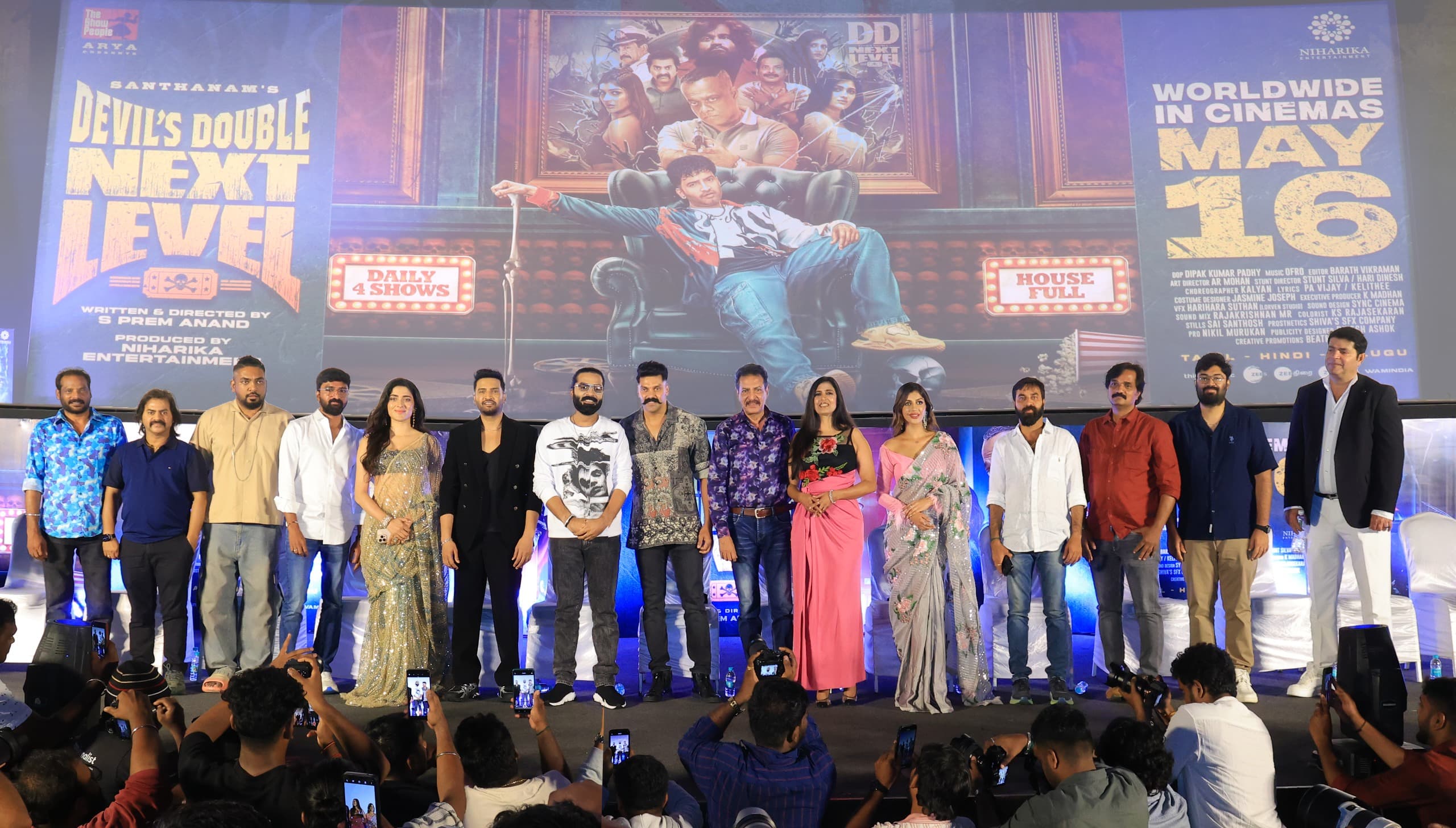 நிஹாரிகா என்டர்டெய்ன்மென்ட் தயாரிப்பில் தி ஷோ பீப்பிள் பேனரில் நடிகர் ஆர்யா வழங்க சந்தானம் நடிப்பில் உருவாகி வரும் 16ம் தேதியன்று உலகம் முழுவதும் திரையரங்குகளில் வெளியாகும் ‘டெவில்ஸ் டபுள் நெக்ஸ்ட் லெவல்’ திரைப்படத்தின் வெளியீட்டு முன் நிகழ்வு சென்னையில் பிரம்மாண்டமாக நடைபெற்றது.