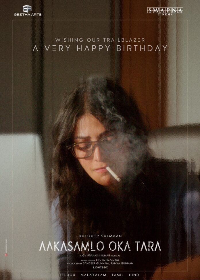 Introducing Shruti Haasan from the world of Dulquer Salmaan’s Aakasamlo Oka Tara; Presented By Geetha Arts & Swapna Cinema, Produced By Sandeep Gunnam, Ramya Gunnam, Pan-India theatrical release in summer 2026