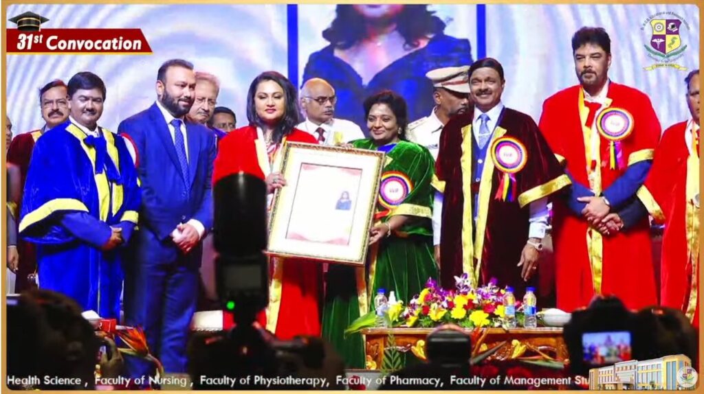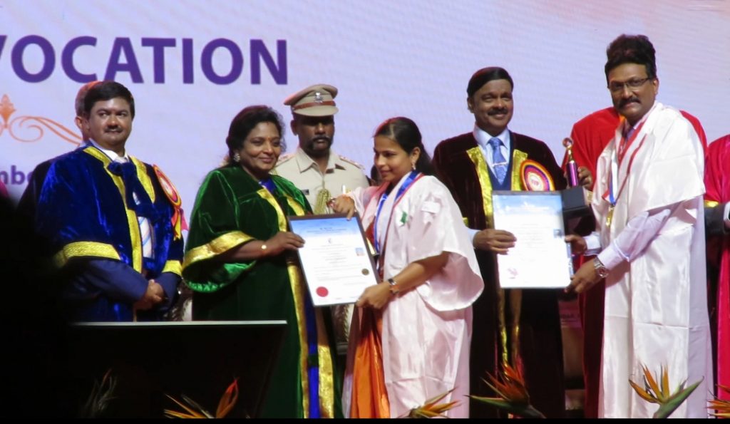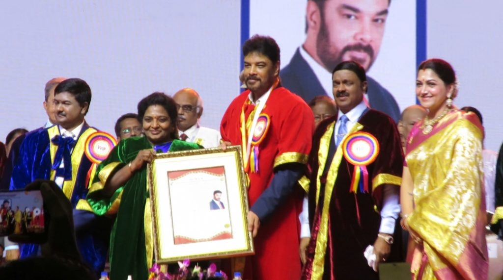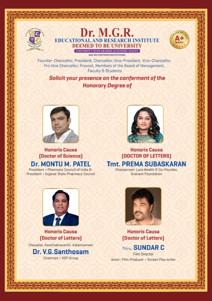 While delivering her convocation address she said that Dr. A.C. Shanmugam who was inspired by the qualities of Purathchi Thalaivar Dr. M.G.R. entered into the public life and also established Educational Institutions of high quality that has helped large number of youth to further their higher education in the chosen fields of study . Later she distributed the degrees to the Rank Holders and Ph.D. Degree awardees . Honorary Doctorate – Doctor of Science ( D.Sc. ) was conferred on Dr. Montu M Patel , the President of Pharmacy Council of India , Honorary Doctorate – Doctor of Letters ( D.Litt . ) – was conferred on Mr. Sundar , C Film Director / Actor , Dr. V.G. Santhosam – Chairman – VGP Group of Companies and Ms. Prema Subaskaran – Health Exponent , Philanthropist , and Women Entrepreneur Dr.A.C. Shanmugam – Founder – Chancellor delivered the keynote address , while Er.A.C.S. Arunkumar – President of the University presided over the Convocation and honoured the Chief Guests . Rest of the eligible graduands belonging to various faculties were presented their degrees through Executive Authorities of our University .