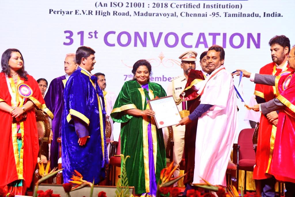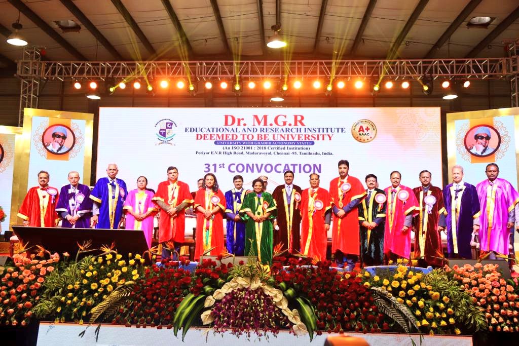 Dr. M.G.R. Educational and Research Institute , Deemed to be University , Maduravoyal , Chennai solemnized its 31st Convocation – Session – 1 at 10.30 a.m. on 7th December 2022 at A.C.S. Convention Centre , A.C.S Medical College and Hospital Campus , Velappanchavadi , Chennai . Dr.C.B.Palanivelu , Registrar informed that 2263 Degrees were awarded to the successful graduands of Ph.D. , PG and UG programmes of M.B.B.S. , B.D.S. , B.P.T. , B.Sc. , BCA , M.D.S. , M.B.A. , M.C.A. , M.P.T. and M.Sc. Her Excellency Dr. TAMILISAI SOUNDARARAJAN , Hon’ble Governor of Telangana & Hon’ble Lieutenant Governor of Puducherry ( Addl . Charge ) was the Chief Guest of the 31st Convocation – Session – 1 Proceedings .